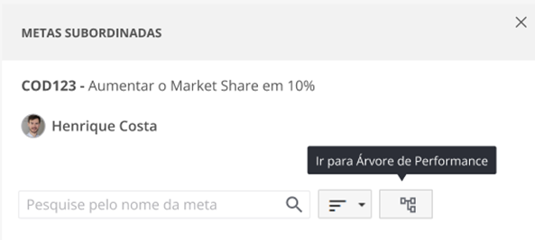 Assim, ao clicar no ícone “Metas Subordinadas” no Painel de performance, além de visualizar as demais metas, incluímos um botão de redirecionamento para a Árvore de Performance.