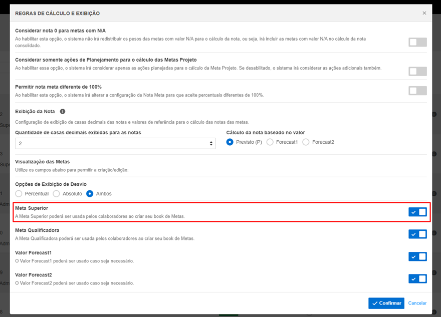 - A opção [Meta Superior] esteja habilitada no Período de Gestão (Configurações> Cadastro > Período de Gestão > Regras de Cálculo e Exibição);