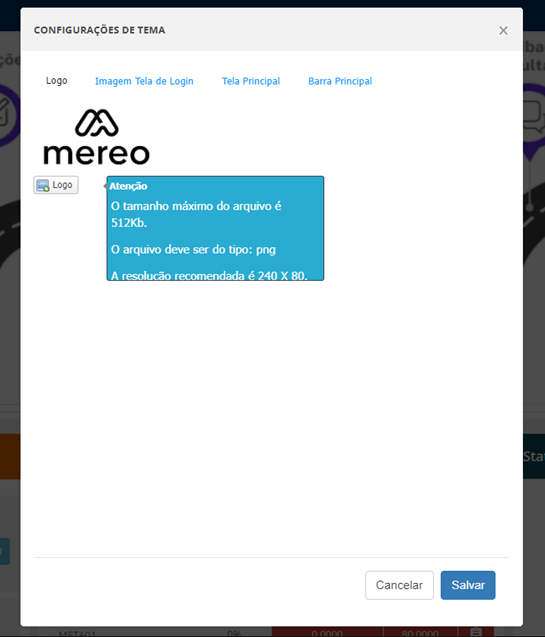 Clicando sobre esse ícone, é possível fazer o upload da imagem desejada. Lembrando que essa imagem aparecerá não só no Menu, como também na tela inicial de Login da plataforma Mereo.