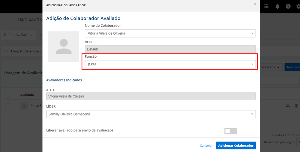 - A Vitoria foi incluída no ciclo com a Função “JCPM” (conforme imagem abaixo). No entanto, identificamos que, na verdade, ela deveria ser avaliada pela Função/ Formulário “Superv”. Suponhamos que tenham vários outros colaboradores nesse mesmo caso e preciso fazer essa alteração via carga de dados para corrigir todos os outros.