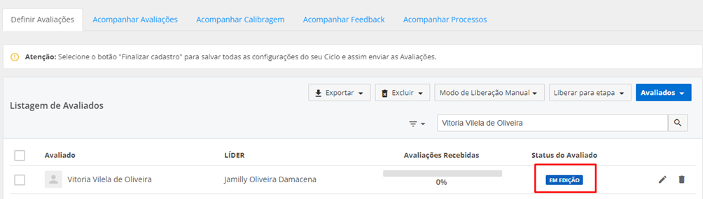 - O primeiro passo é garantir que todos esses avaliados que terão o formulário alterado estejam no status “Em edição”: