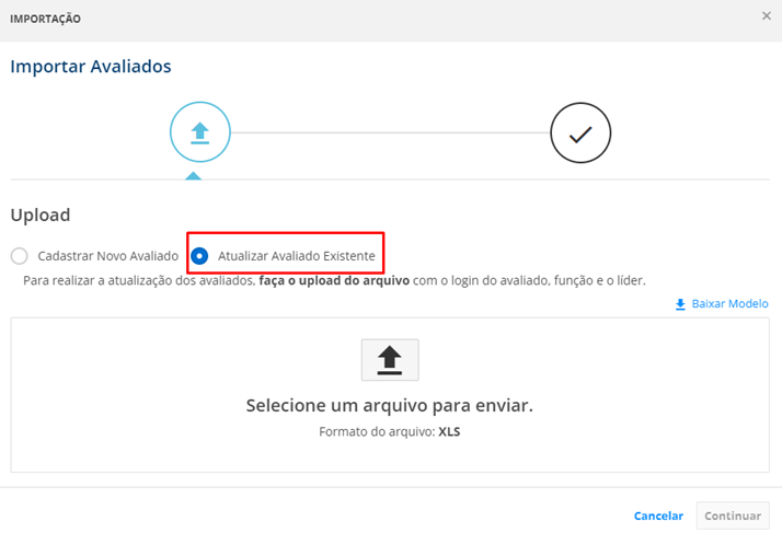 - Na tela “Importar Avaliados” é preciso selecionar a opção “Atualizar Avaliado Existente”.