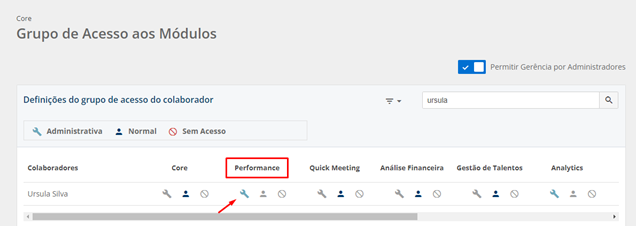 Importante: a chave administrativa, do módulo Performance, precisa estar habilitada para que o usuário Administrador esteja apto para utilizar a funcionalidade do Filtro Padrão.