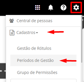 1. Com um perfil de Administrador, acesse as Configurações da Plataforma (Engrenagem), expanda a opção Cadastros e clique em Períodos de Gestão: