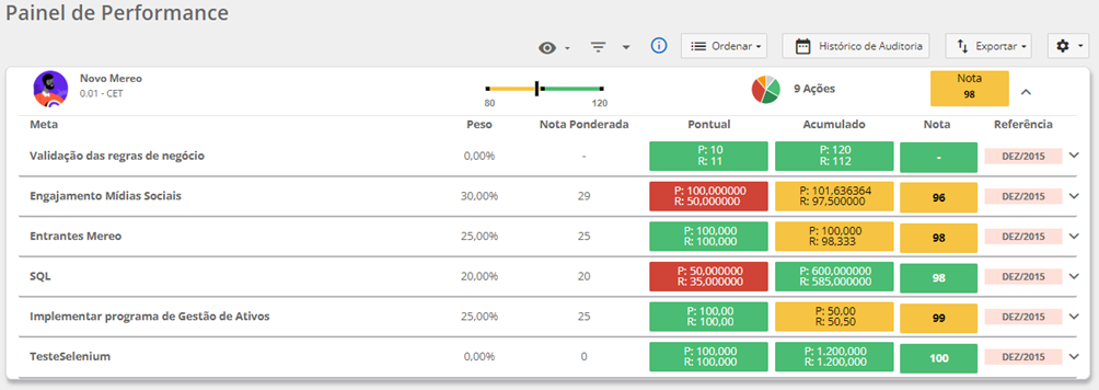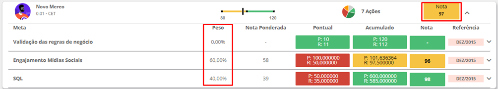 No Painel abaixo, estão listadas todas as metas de uma pessoa sem o filtro por Rótulo e sua nota final é 98: