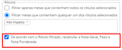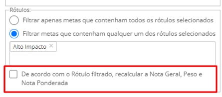 Caso a opção [De acordo com o Rótulo filtrado, recalcular Nota Geral, peso e Nota Ponderada] não seja selecionada, não haverá o recálculo da Nota Final mencionado anteriormente, apenas exibirá as Metas que possuem o rótulo “Alto Impacto”.
