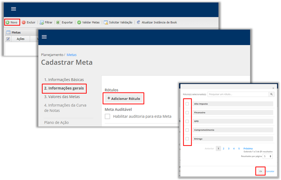 Agora, associe os Rótulos as respectivas Metas durante a criação ou edição: