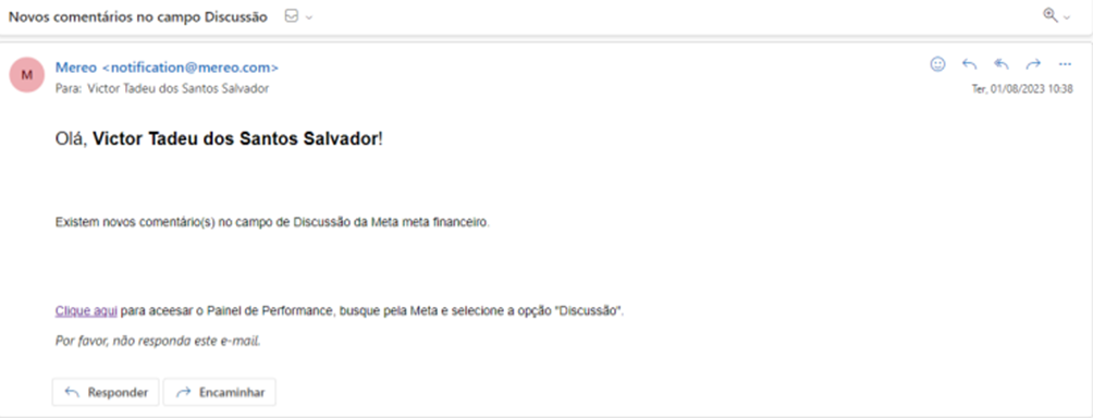 Ao realizar o comentário na Meta, caso ela seja compartilhada, as demais pessoas que compartilham dessa meta receberão uma notificação por e-mail sobre o comentário realizado: