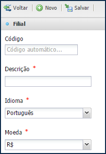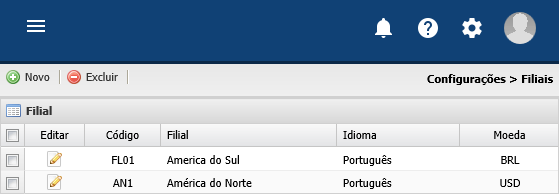A lista pode exibir uma filial padrão do sistema (use-a se atender sua realidade). Importante ressaltar que só é possível cadastrar filiais via tela, não é possível incluí-las por carga de dados.