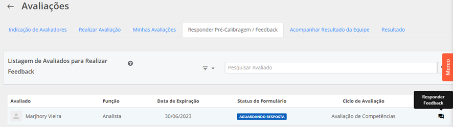 1. Clique em Menu > Competências > Avaliações > Responder Pré Calibragem/Feedback. Estarão listados todos os avaliados pelos quais o líder é responsável pelo feedback: