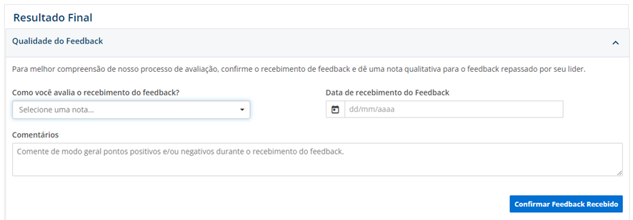 - Caso o administrador tenha configurado que você só poderá acessar o Resultado depois de avaliar a qualidade do feedback recebido, será preciso preencher os campos abaixo e clicar em "Confirmar Feedback Recebido" para acessar o Resultado: