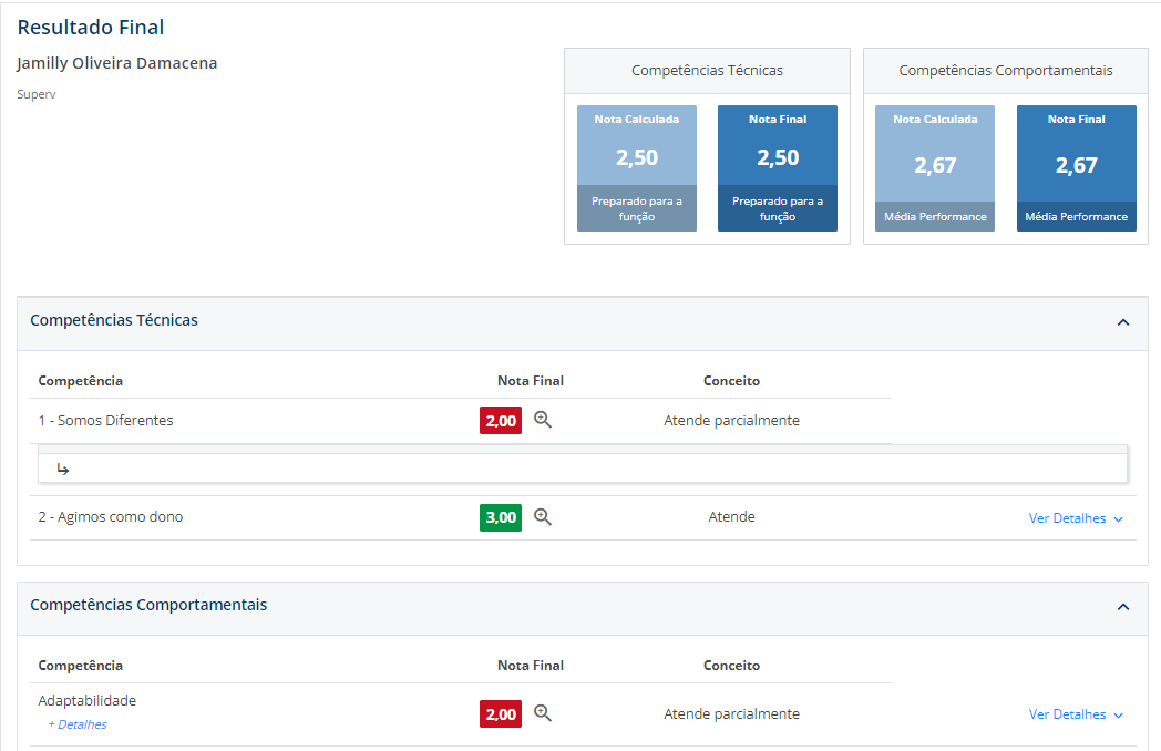 - Depois disso, será possível visualizar o Resultado, ou seja, o Resumo do feedback, onde estarão as informações referentes ao ciclo de avaliação que o administrador configurou para que o avaliado visualizado.