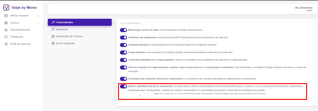 Em [Configurações] > [Funcionalidades], adicionamos a opção “Alterar a quantidade mínima de respondentes”.