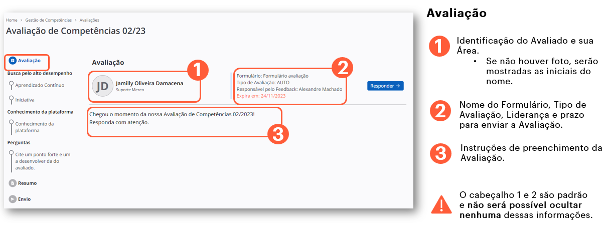 Nas informações iniciais, sinalizadas como Avaliação, são apresentadas: (1) informações sobre o avaliado, (2) o formulário e o ciclo de avaliação. Além disso, abaixo estão as (3) instruções de preenchimento.