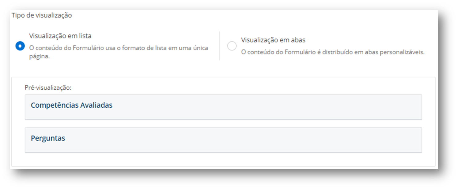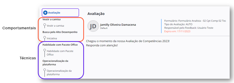 - Caso haja a divisão entre Competências Técnicas e Comportamentais no momento da sua criação, as Competências Comportamentais são exibidas primeiro (seguindo a ordem do código) e só depois aparecem as Técnicas.