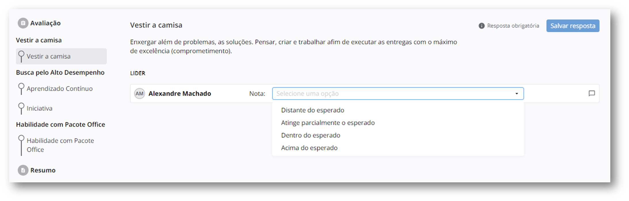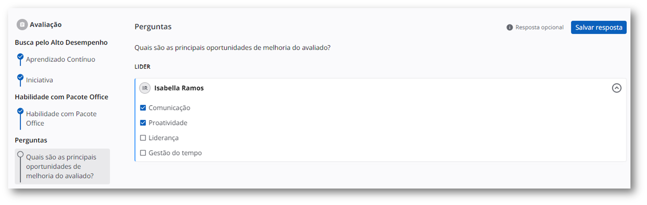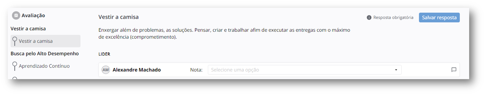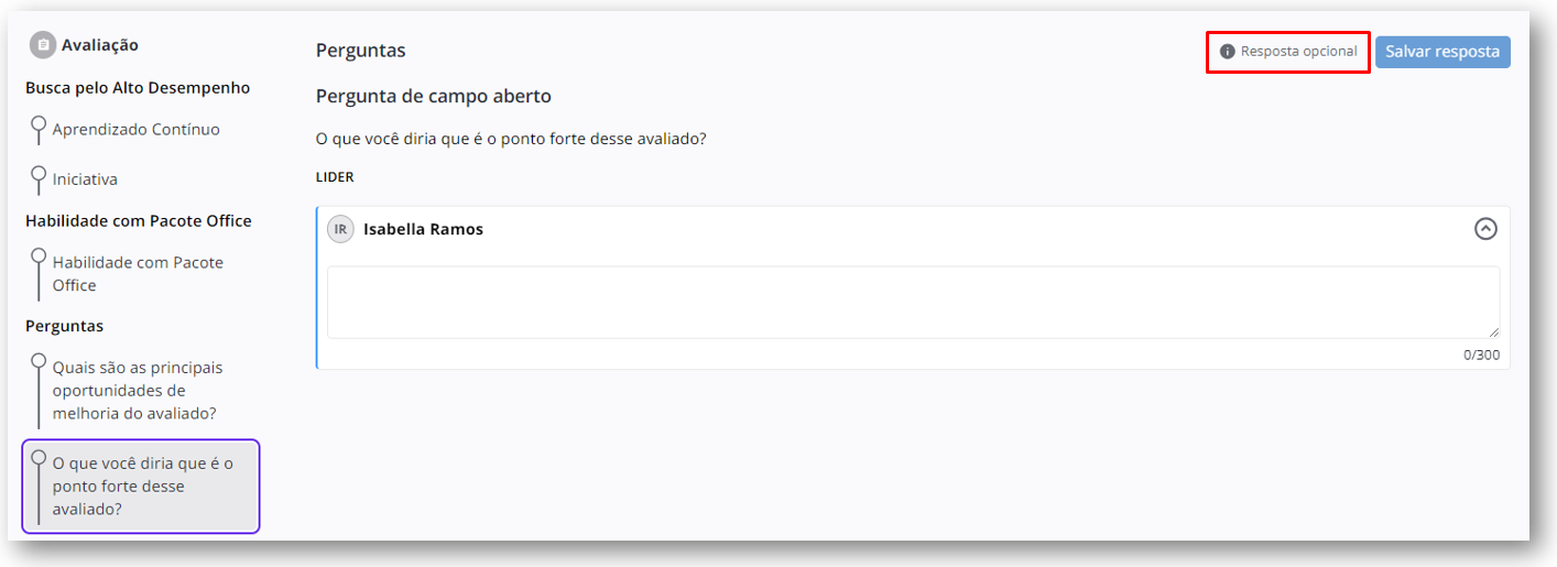 Caso tenham Perguntas no formulário de avaliação, elas aparecerão abaixo das Competências no menu à esquerda. Como elas não possuem código em sua criação, ficam ordenadas de acordo com o alfabeto. Além disso, fica sinalizado se a resposta é opcional ou obrigatória.