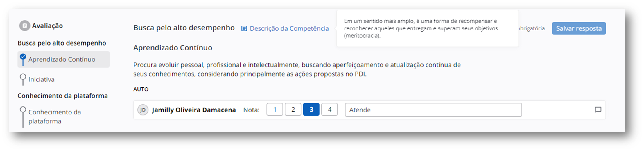 Para responder a avaliação e atribuir as notas, clique em "Responder" ou sobre a Competência desejada que ao lado direito será exibida a descrição e as opções de nota: