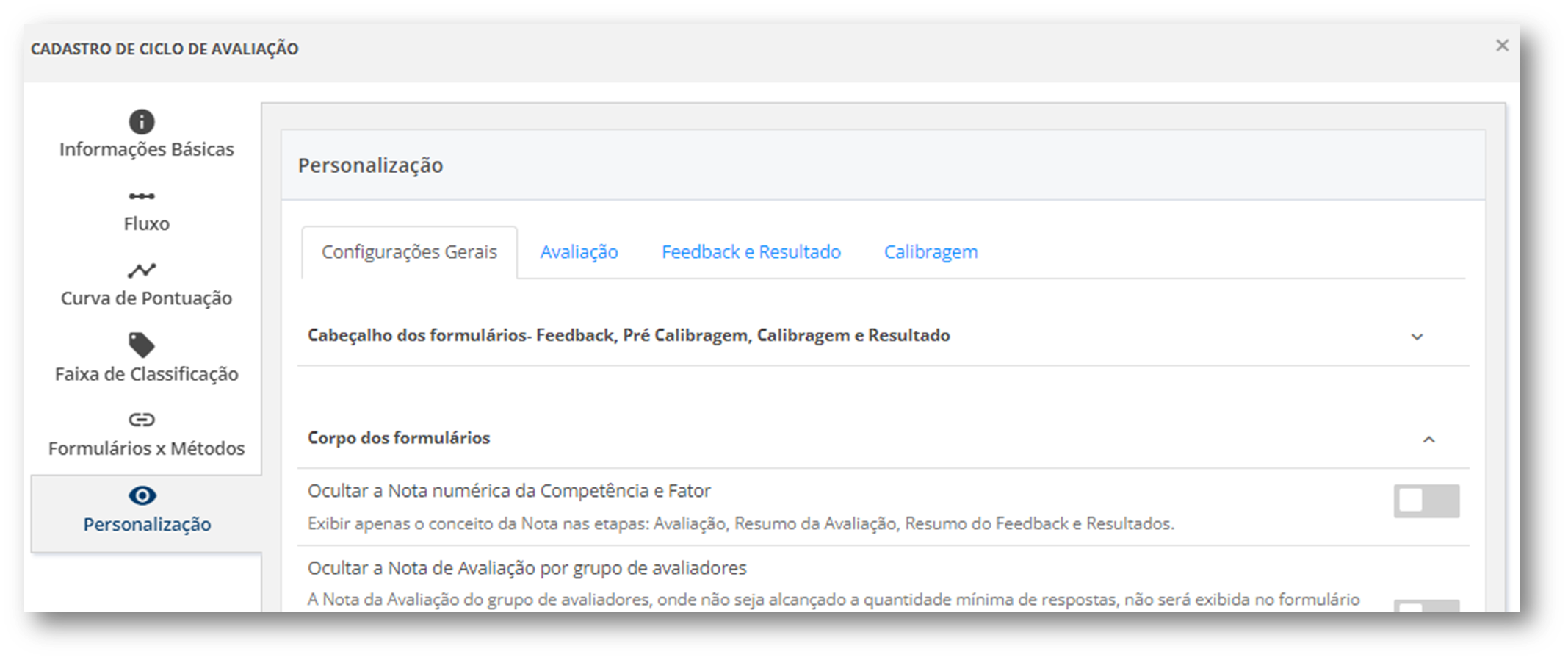 A definição da exibição das notas é feita no Cadastro de Ciclo de avaliação, em "Personalização" > aba "Configurações Gerais" > seção "Corpo dos formulários"> "Ocultar a Nota numérica da Competência e Fator". Ative o botão se deseja mostrar somente o conceito da nota (primeira opção) e desative caso queira mostrar número e conceito (segunda opção):