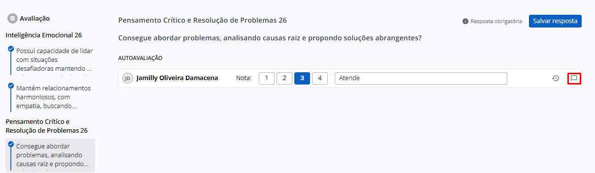 As Competências e Fatores que receberem notas, ficam com o ícone em azul () e as pendentes de resposta, ficam em cinza.