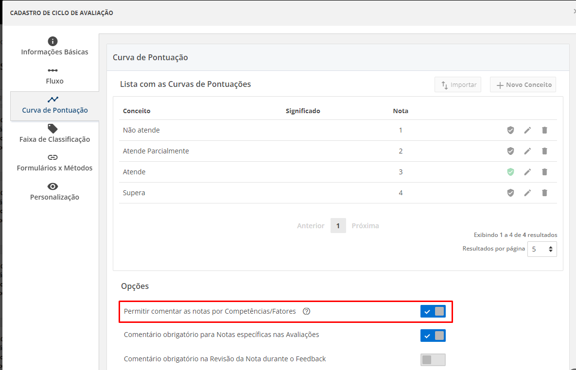 O ícone da caixinha de diálogo para realização de comentários só será exibida se, no Cadastro do ciclo > Curva de pontuação, tiver sido ativada a opção de permitir comentários.
