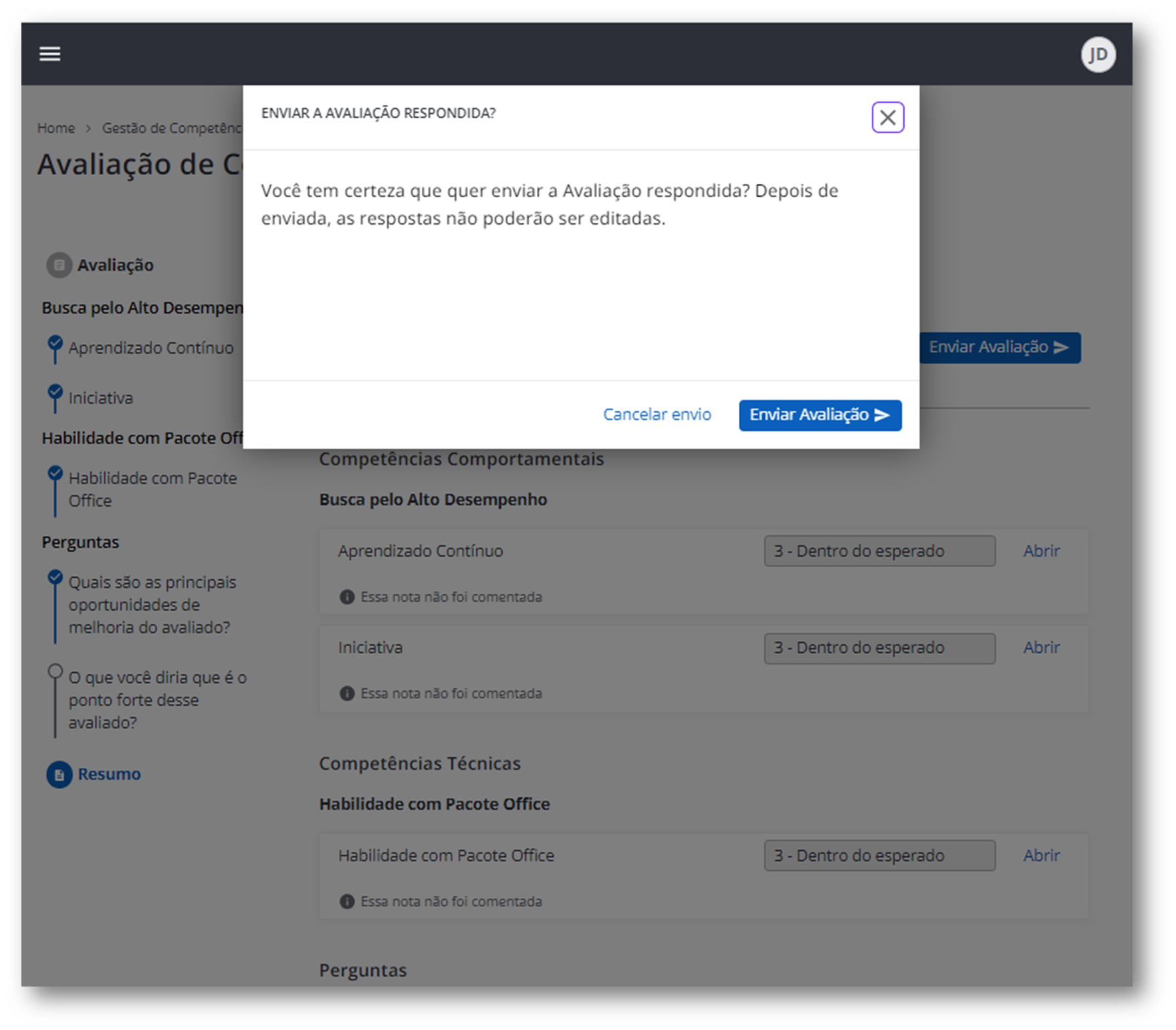 Depois de clicar em "Enviar Avaliação", confirme que seja enviá-la: