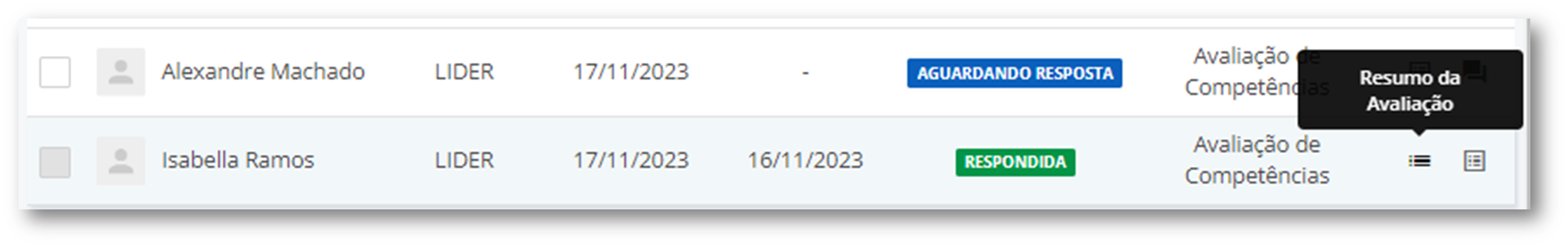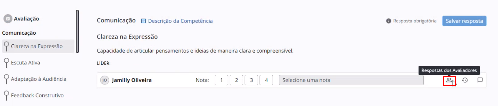 Dessa forma, enquanto estiver realizando a avaliação de seu liderado, o gestor poderá acessar as respostas dadas pelos demais avaliadores que já tiverem enviado seu formulário de avaliação ao clicar no ícone sinalizado abaixo: