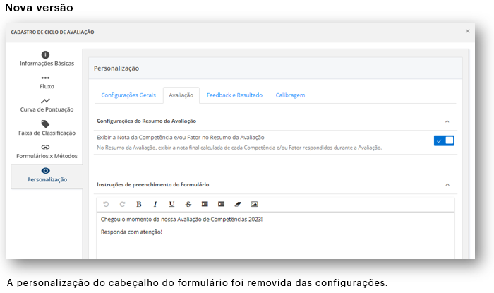 Com exceção da parte de Instruções de Preenchimento, as informações dos cabeçalhos não são personalizáveis. Portanto, as configurações na aba "Personalização" no momento da criação do Ciclo ficarão da seguinte forma: