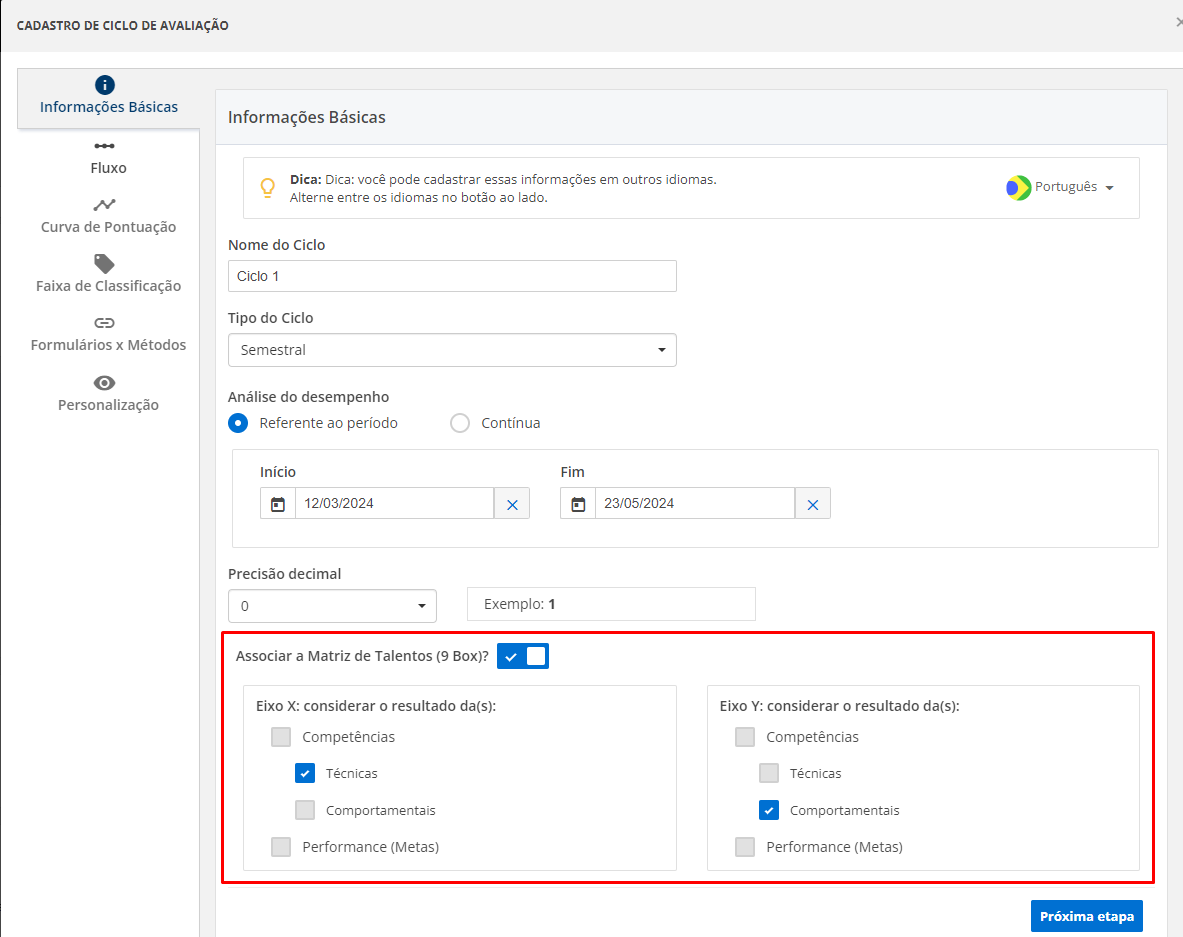 Para que haja essa divisão, é necessário que, no Cadastro do Ciclo > Informações gerais, os eixos X e Y sejam definidos de acordo com o tipo de competência e que na criação da competência haja associação com um dos tipos.