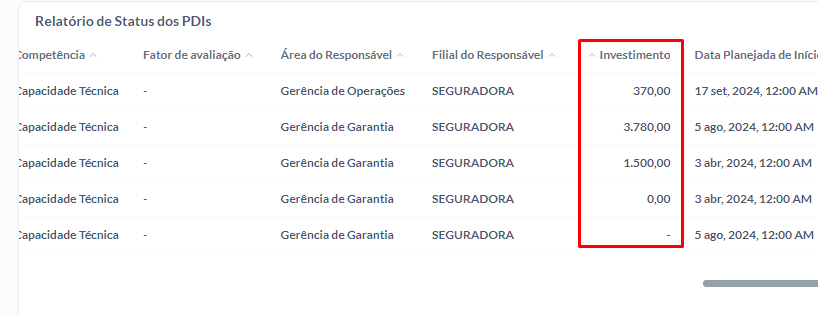 Para tornar a análise e acompanhamento dos PDIs ainda mais completa, incluímos uma coluna que traz a informação do investimento da ação cadastrada, caso haja. Se o valor não tiver sido preenchido durante a criação da ação de PDI, o valor apresentado no relatório será 0.