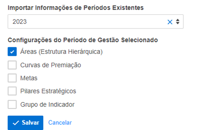 Vale ressaltar que a informação Importar Informações de Períodos Existentes poderá ser configurada apenas uma vez, na etapa de Criação do Período de Gestão.