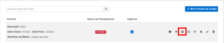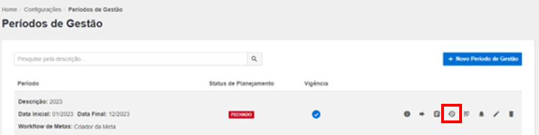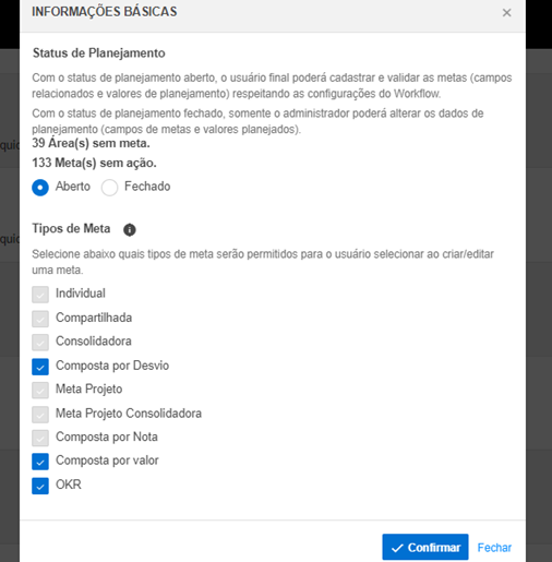Nesta parte podemos verificar e alterar o status de planejamento daquele período, bem como definir os tipos de meta que serão permitidos para o usuário selecionar ao criar/editar uma meta.