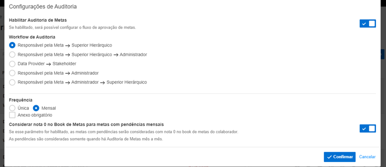 Além disso, também será definida a frequência de auditoria, podendo ser mensal ou anual.