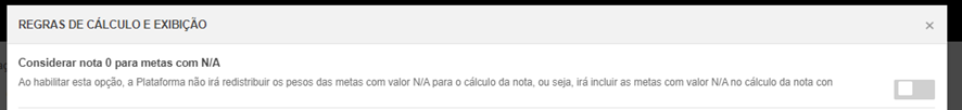 A opção Considerar nota 0 para metas com N/A habilitada faz com que o sistema não redistribua os pesos das metas com valor N/A para o cálculo da nota e estes valores serão contabilizados no cálculo da nota consolidado.