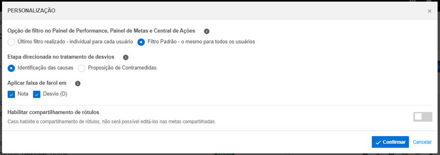 Ao Habilitar compartilhamento de rótulos, os rótulos cadastrados nas metas individuais serão os mesmos para as metas compartilhadas, ou seja, não será possível editá-los nas metas compartilhadas.