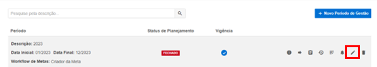 Para editar, clique no botão referente ao período a ser editado. O processo de edição é semelhante ao processo de criação de um novo Período de Gestão. Faça as alterações necessárias e clique em "Salvar" para guardar suas mudanças.