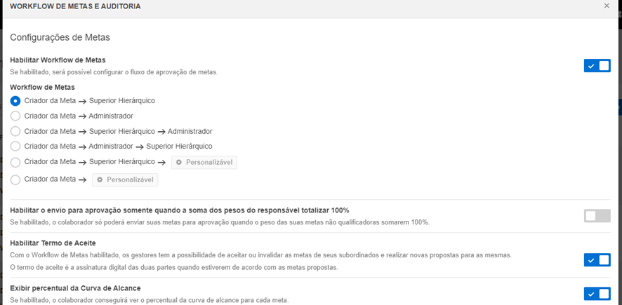 A opção Habilitar Workflow de Meta define se haverá validação das metas entre os níveis hierárquicos. Nesta tela que será definido o fluxo de aprovação das metas.