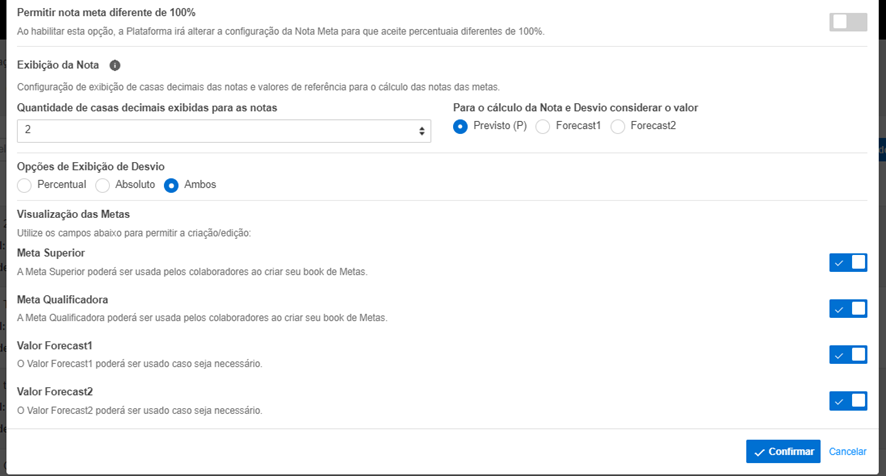 A opção Permitir nota meta diferente de 100% habilitada permitirá alterar a configuração da Nota Meta para que aceite percentuais diferentes de 100%.