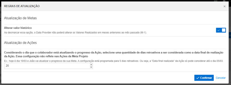 Podemos configurar também a quantidade de dias retroativos a ser considerada como a data final de realização da Ação. O usuário poderá atualizar a ação até a data retroativa configurada no Período de Gestão. Caso seja 0, o usuário poderá apenas colocar uma data-fim realizada até a data atual.