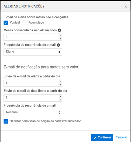 Ao definir esse gatilho, irão aparecer duas configurações adicionais que irão definir quantos meses consecutivos de resultados pontuais ou acumulados não alcançados serão necessários para que o e-mail de alerta seja enviado e a frequência de recorrência desses e-mails, podendo ser diária, semanal ou mensal.
