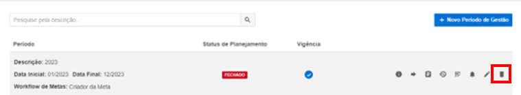 Se não houver metas ou outros dados relacionados ao período, o sistema exibirá uma mensagem de confirmação. Caso contrário, o sistema irá exibir uma mensagem informando que a exclusão não é permitida e o período não será excluído. É importante ressaltar que o sistema deverá ter pelo menos um período de gestão ativo.