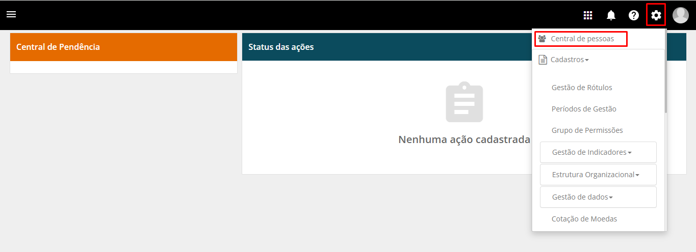 Para inativar um usuário, vá na barra de menu principal e clique em Configurações e depois em Central de Pessoas: