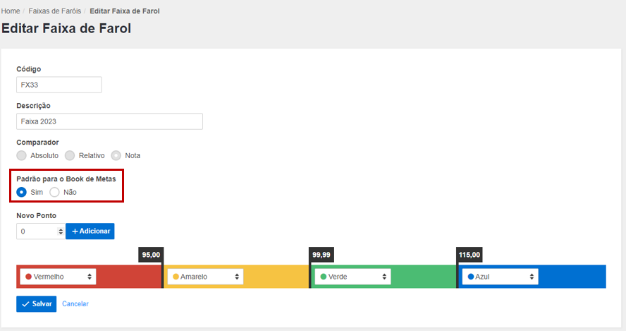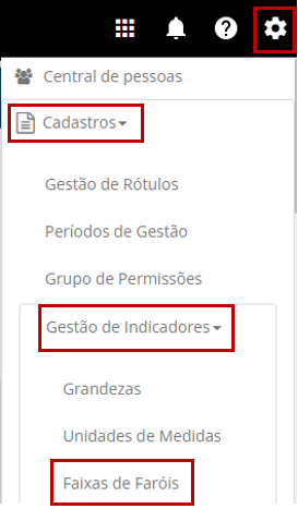 Acesse Configurações > Cadastros > Gestão de Indicadores > Faixas de Faróis.