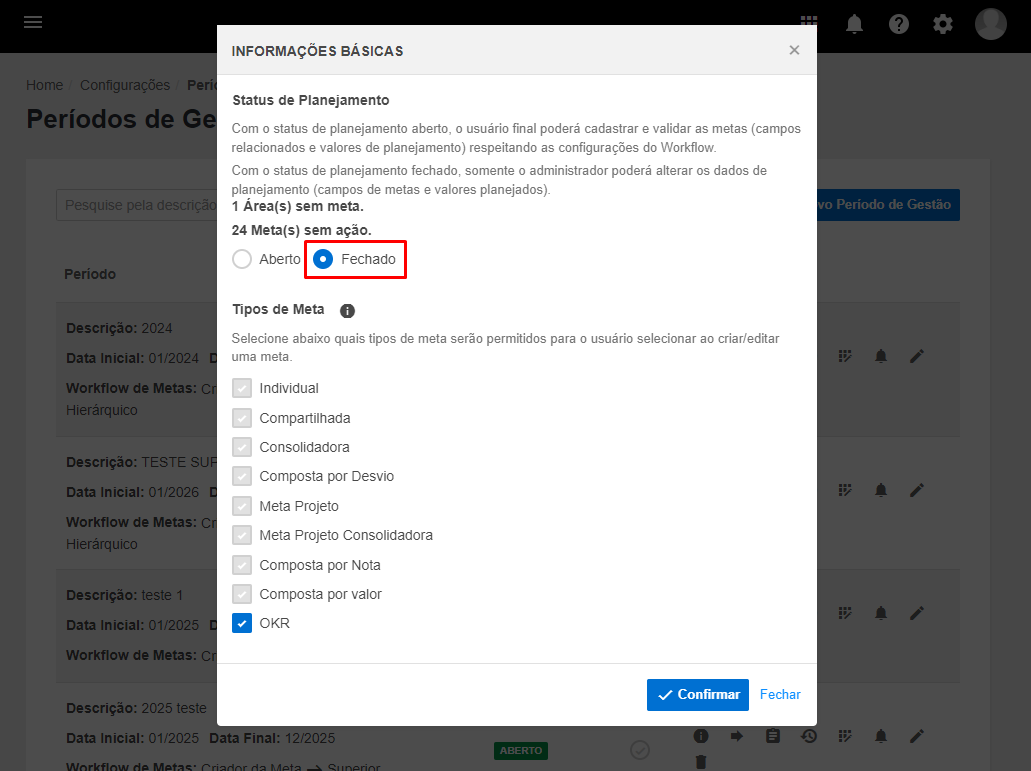 No Metas, as configurações de como será feito o cadastro e imput dos valores das metas são feitas no Período de Gestão. Enquanto o período de gestão vigente estiver com o status "Aberto", aqueles que possuem a tela de Cadastro de Metas, conseguirão fazer edições nesses cadastros. Para bloquear esses cadastro e permitir somente a inclusão de valores realizados, é necessário alterar o status do Período de Gestão para "Fechado".