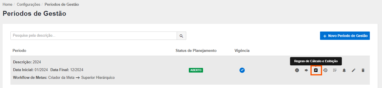Procure pelo período de gestão desejado e à direita estarão dispostos os ícones de edição. Clique em Regras de Cálculo e Exibição: