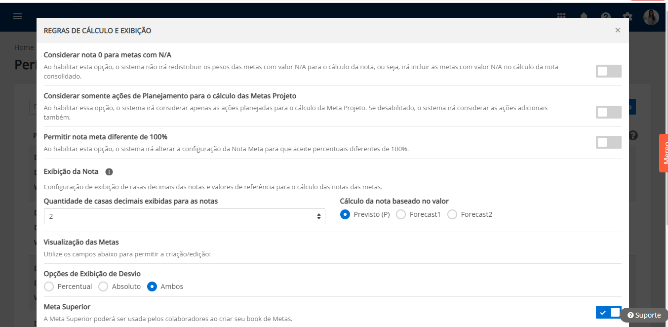 Ao habilitar essa opção, a plataforma irá considerar apenas as ações planejadas para o cálculo da Meta Projeto. Se desabilitado, também considerará as ações adicionais, como as ações de Contramedida por exemplo.