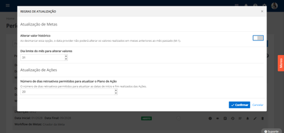 - Defina o número de dias retroativos permitidos para atualizar as datas de início e fim das ações.