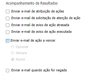 Define o comportamento do campo de alerta de e-mail ao cadastrar uma ação: