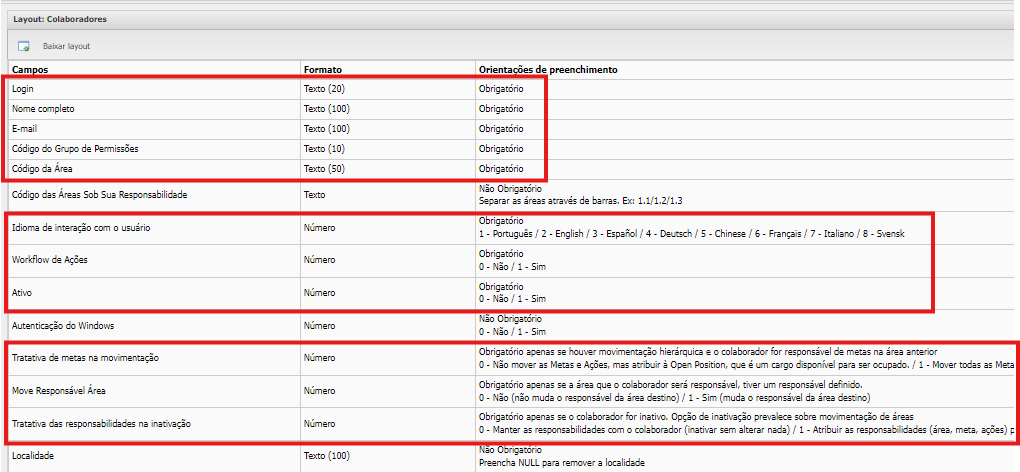 Ao utilizar a carga de dados, você terá informação ao layout, os campos contidos e a as orientações de preenchimento, como o exemplo abaixo: