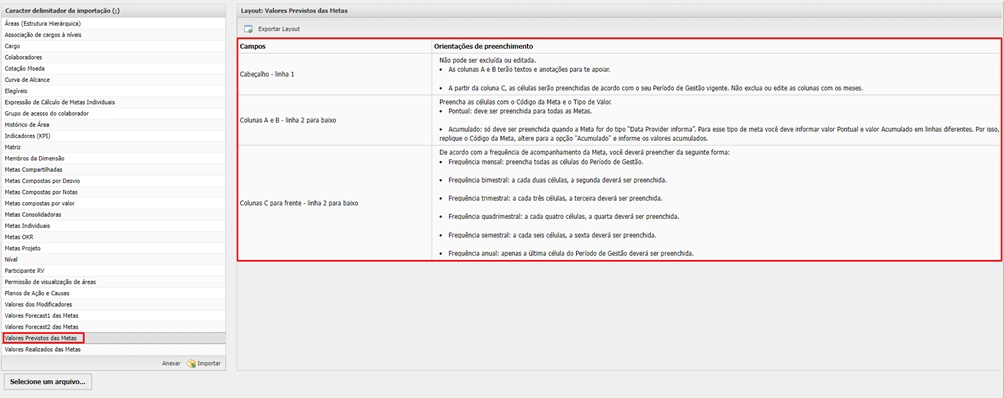Ao selecionar um dos quatro tipos de Carga de Valores, do lado direito estarão descritas as instruções de preenchimento (exemplo abaixo: Valores Previstos das Metas):