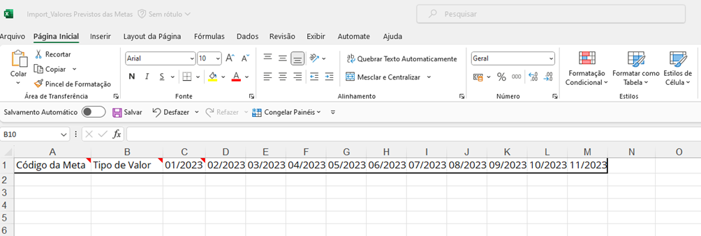 Ao exportar a carga de valores, verá que ela trará nas colunas as quantidades de meses do período de gestão: